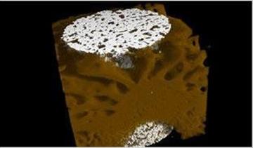 Malzeme araştırmacıları, uygun biyouyumluluk ve üstün yüzey pürüzlülüğü ve mukavemeti sunan titanyum köpükten yapılmış kemik implantları geliştirmektedir. Bu tıkaçları tavşanlara yerleştirdikten birkaç hafta sonra, CT araştırması, parçalanmış gözenekli implant yapısındaki kemik büyümesini görselleştirir ve nicelleştirir.